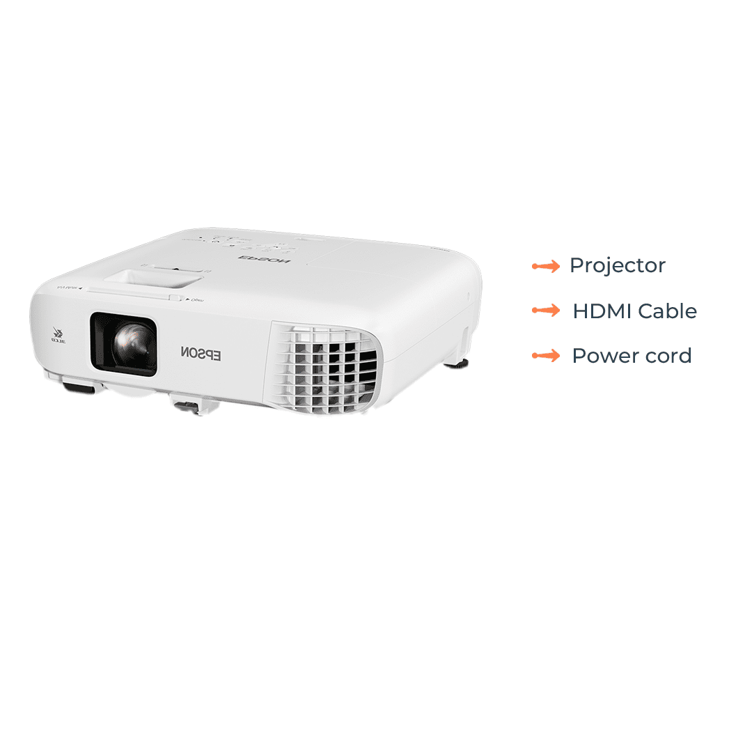 The most common and effective pairing is the projector with a professional screen. Our Projector Screen (Available separately in 4ft × 6ft, 6ft × 8ft, and larger sizes) dramatically improves picture quality. Furthermore, it gives a crisp, uniform viewing surface that a wall cannot replicate, instantly elevating the professionalism of your event.